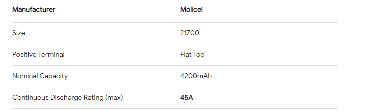بهترین مطلق 21700 جریان بالا در بازار: Molicel P45B. این سلول برای سازندگان سوپراسپرت ساخته شده است تا ظرفیت بالایی داشته باشد و در عین حال دارای مقاومت داخلی فوق العاده کم باشد. این بدان معناست که سلول می تواند جریان های بسیار بالایی داشته باشد در حالی که خنک می ماند.